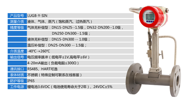 LUGB-Y-SIN抗震振渦街流量儀表廣泛用于供熱公司、熱力公司、化工行業(yè)等行業(yè),對過熱蒸汽、飽和蒸汽、壓縮空氣和一般氣體、水和液體的計量和控制。加厚本體,可有效避免現(xiàn)場管道振動帶來的數(shù)據(jù)波動和誤差。